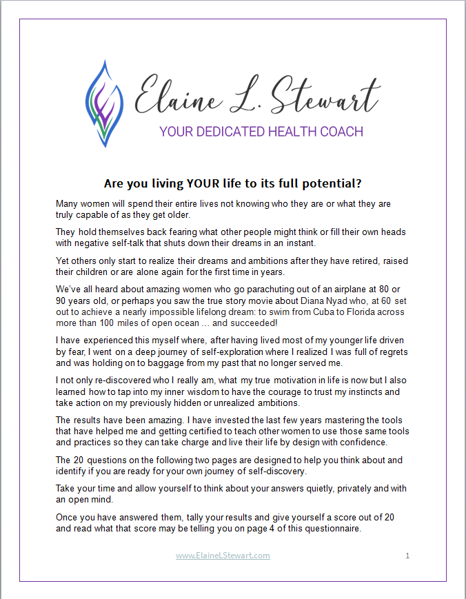 In this free, for your eyes only, questionnaire I ask 20 Yes/No questions to help you explore if you are holding yourself back and if you are ready to take the first or next step into a journey of deep self discovery from the inside out.